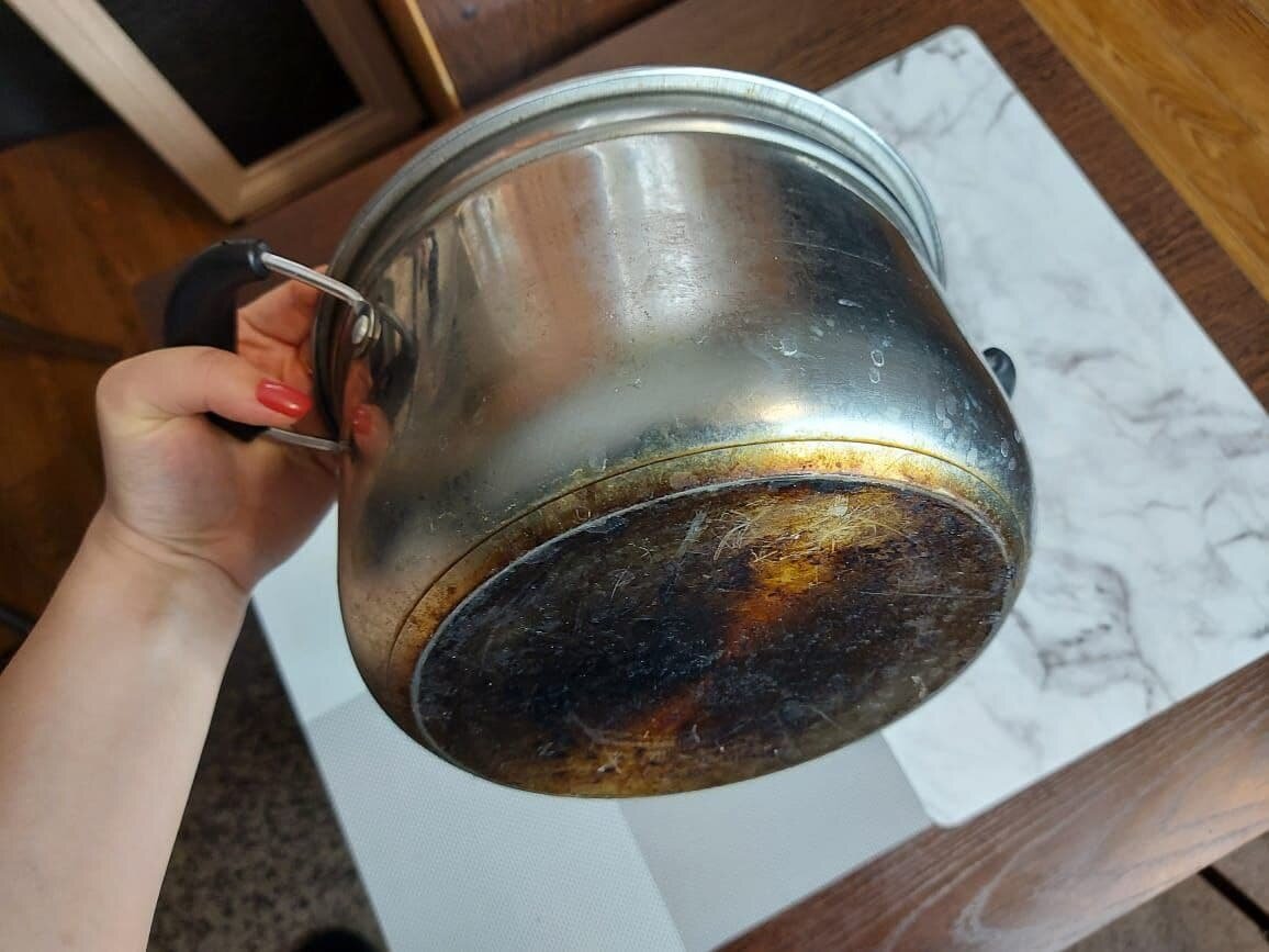 Попробуйте средство для очистки духовок: нанесите средство на кастрюлю, оставьте на некоторое время, а затем промойте кастрюлю горячей водой.