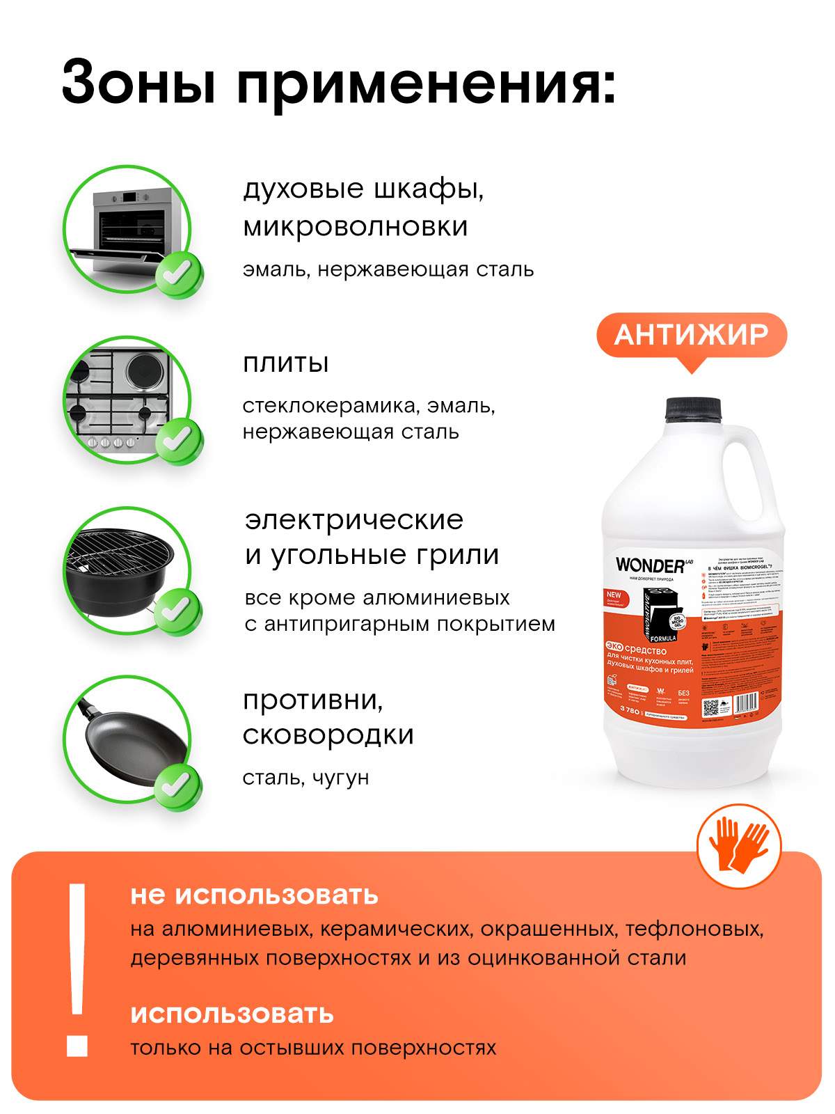 Наш совет: предварительно протрите духовку влажной тряпкой, чтобы удалить крупные загрязнения, а затем примените Wonder для более глубокой и качественной чистки.