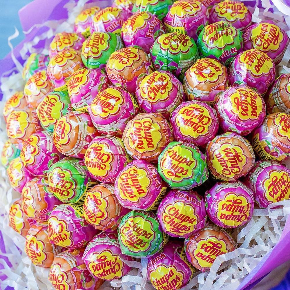 Выберите разноцветные чупа чупсы разных форм и вкусов, чтобы создать яркую и разнообразную композицию букета.