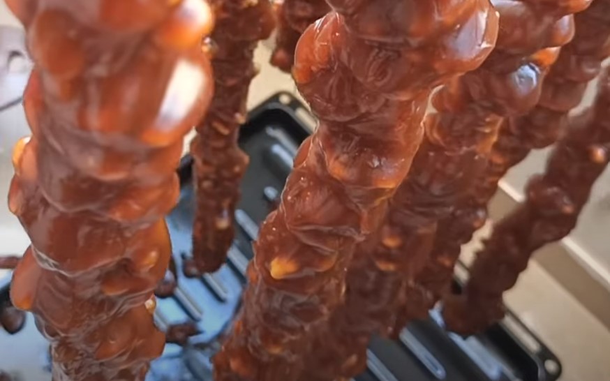 Сушите чурчхелу на противне, покрытом бумагой для выпечки. Равномерно разложите полоски яблок и оставьте их в сушке на 2-3 дня до полного высыхания.