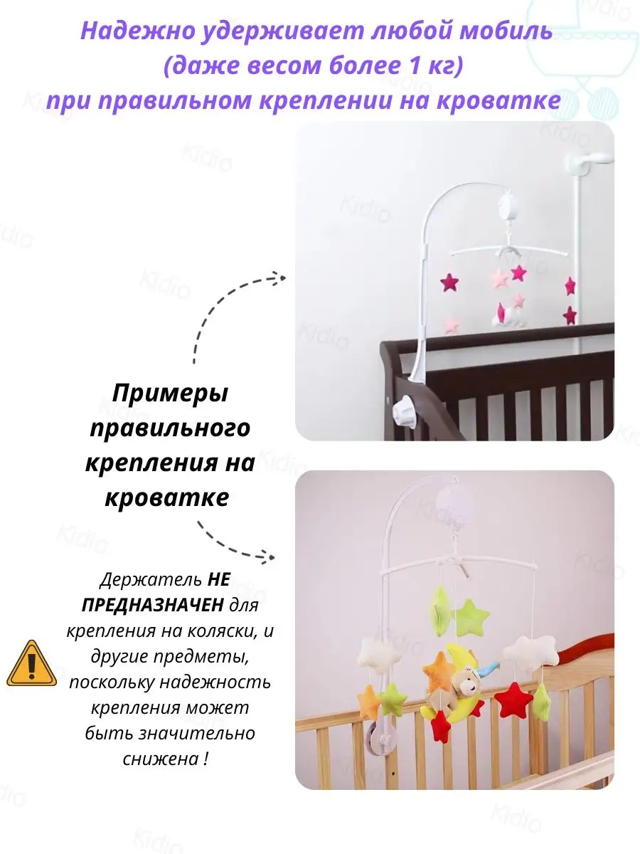 Установите крепление таким образом, чтобы мобиль был на безопасном расстоянии от ребенка, но при этом он мог видеть и играть с ним.