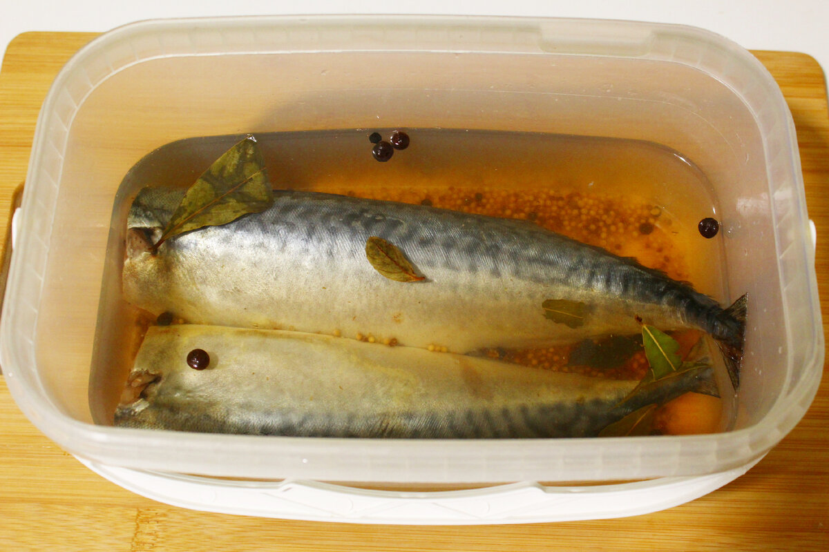 Уложите скумбрию в чистую емкость вместе с маринадом.