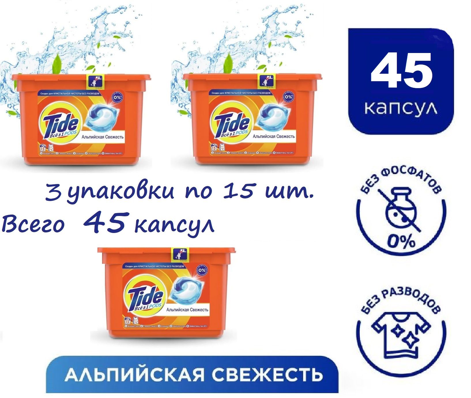 Выберите подходящий режим стирки и температуру в соответствии с рекомендациями на этикетке вашей одежды. Tide Альпийская свежесть 15шт подходят для стирки различных видов тканей.