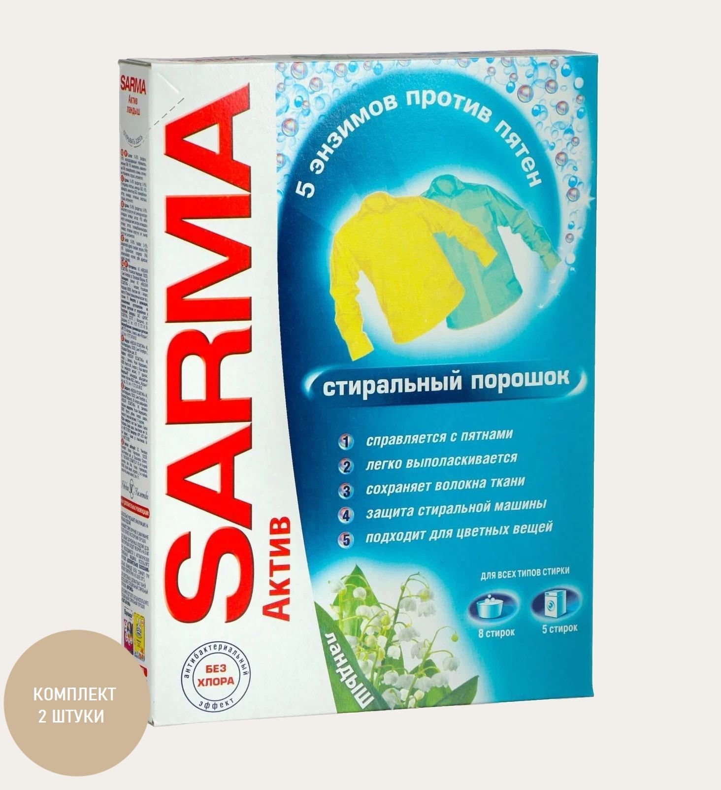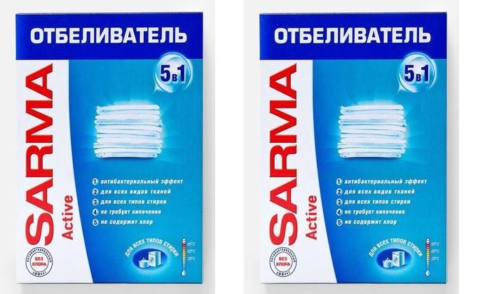 Порошок сарма автомат с отбеливающим эффектом также подходит для стирки цветной одежды, однако перед использованием проверьте его на небольшом участке ткани на сохранность цвета.