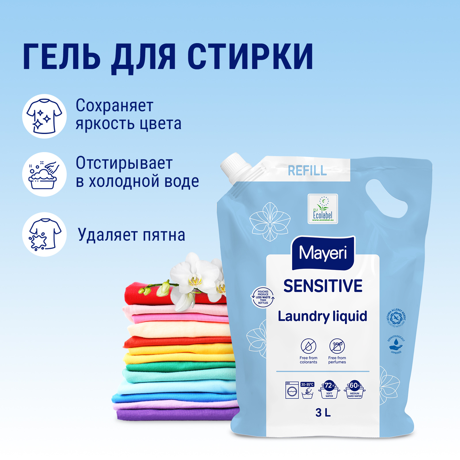 Используйте стиральный порошок Mayeri Sensitive при низких температурах, чтобы сохранить качество и цвета вашей одежды.