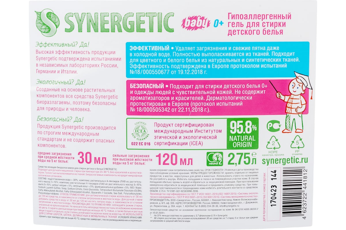 Эко гель для стирки детского белья Synergetic, хорошо ли отстирывает, - состав, отзывы, обзор, цена