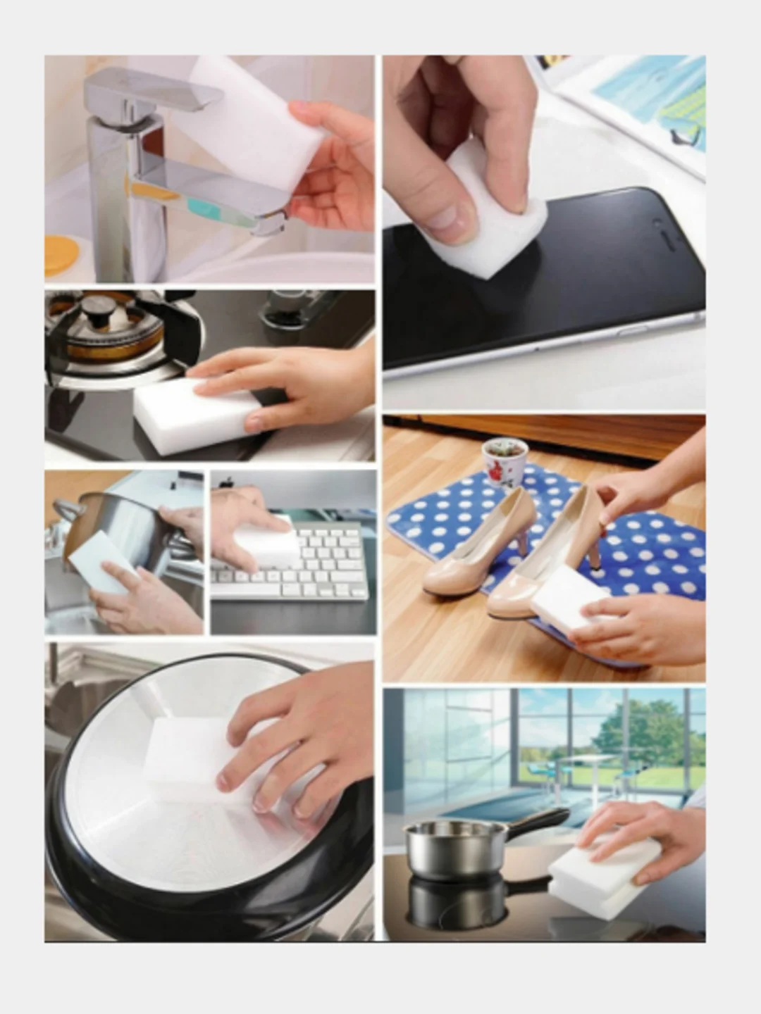 Меламиновая губка может быть использована для очистки различных поверхностей, включая стекло, керамику, пластик, сталь и т.д. Она очень универсальна и эффективна в борьбе с различными проблемными пятнами и загрязнениями.
