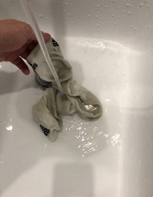 Потрите носки друг о друга, чтобы удалить оставшиеся пятна и грязь.