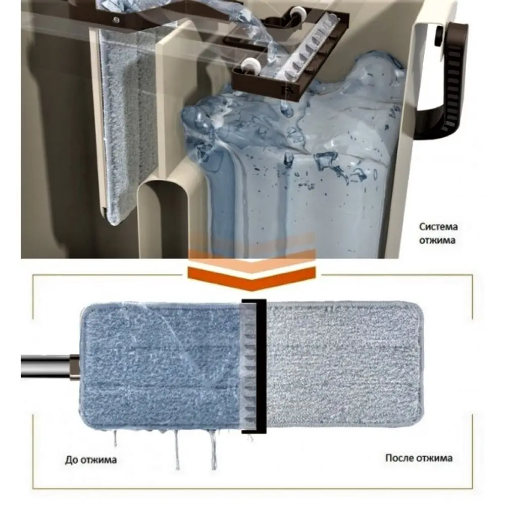 Экономия времени: благодаря специальному механизму, эту швабру нужно обмакивать всего один раз - она сама выжимает грязную воду и остается готова к очередному использованию.
