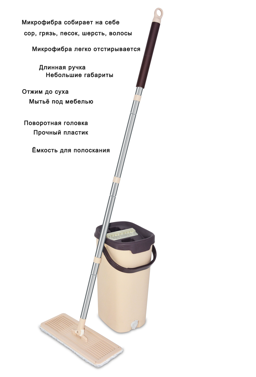 Экологически чистый выбор: самоочищающаяся швабра использует только воду, без использования химических средств, что делает ее экологически безопасной.
